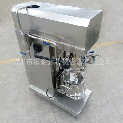 5L雙行星混合攪拌機有高速、低速、活動刮板作攪拌、剪切、刮壁、溶解用。低速運轉的攪拌錨使物料在密閉容器內上下翻動、剪切和混合,高速運轉的齒形分散盤與混合的物料產生強烈的碰擊和剪切,隨著攪拌錨的旋轉,行星架上的活動刮刀隨著旋轉,把釜體上的物料完全刮掉,使聚集物完全、徹底地達到混合、分散、溶解的要求。在其高低速的不同作用下,使物料能夠達到均勻的混合和分散。